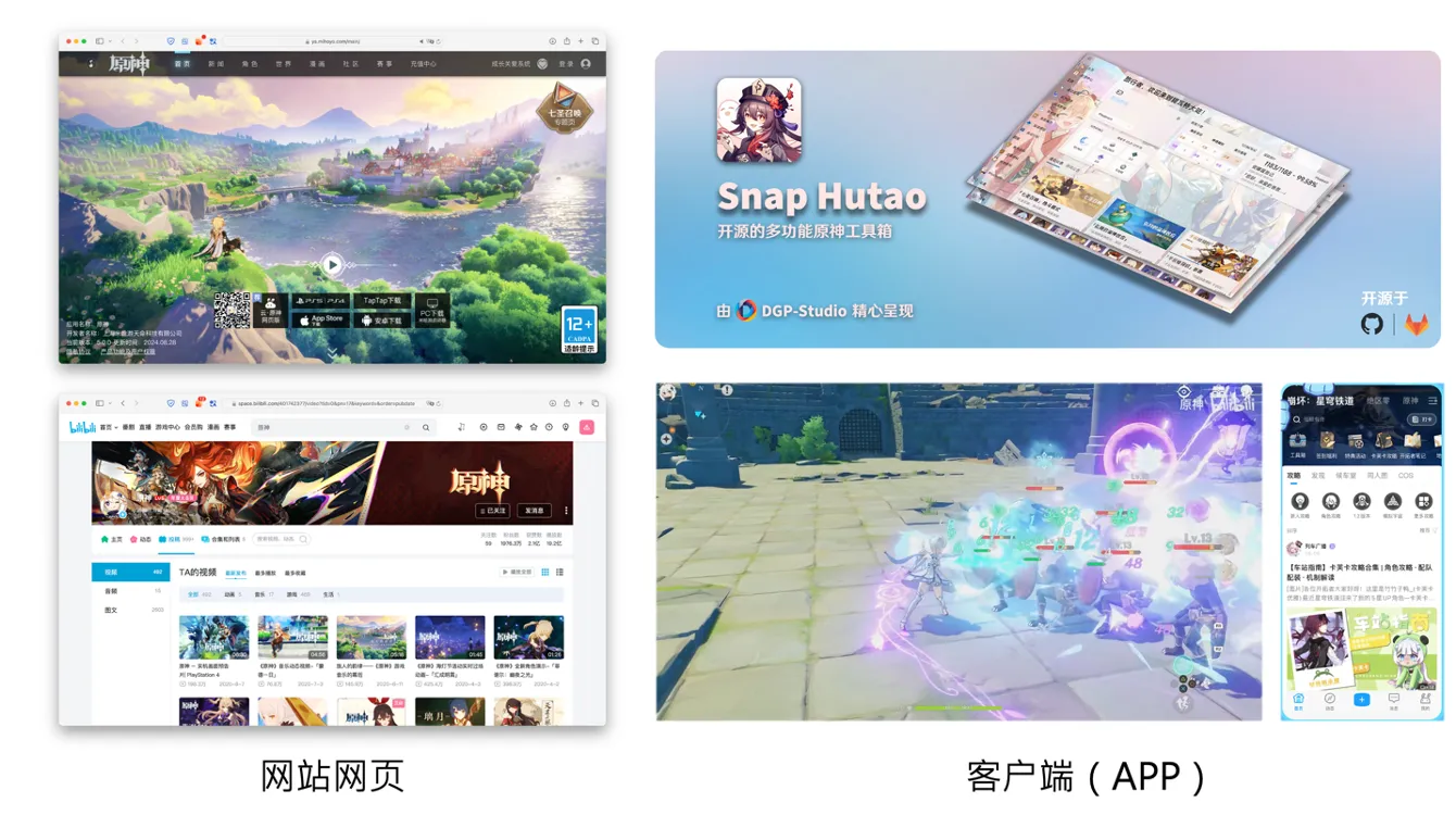 左上原神官网,左下原神B站官方帐号,右上胡桃工具箱,中下原神B站官方帐号发放的视频,右下[App Store 里的米游社APP]